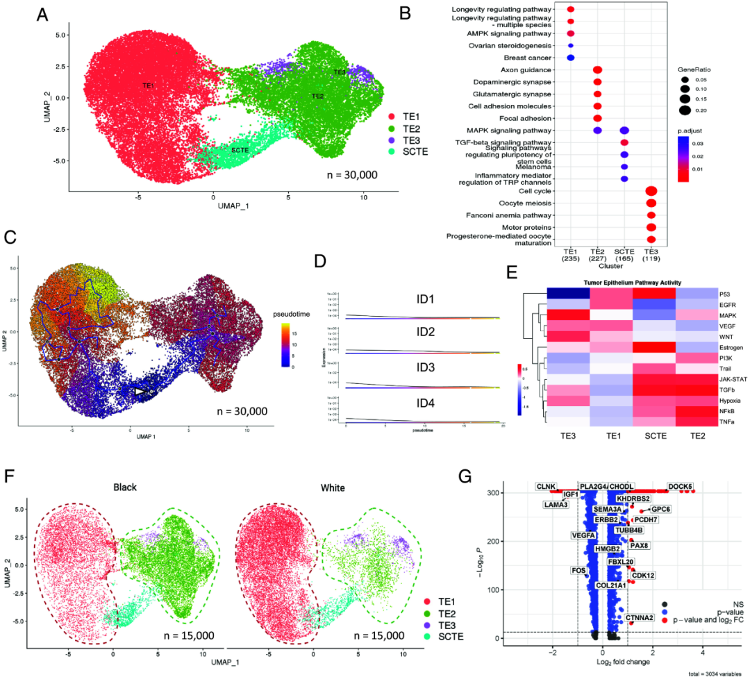 通過(guò)對(duì)13例USC腫瘤(4例白人,9例黑人)進(jìn)行snRNA-seq,共分析102,431個(gè)細(xì)胞核,鑒定出6種主要細(xì)胞類型:腫瘤上皮細(xì)胞、纖毛上皮細(xì)胞、基質(zhì)成纖維細(xì)胞、髓系細(xì)胞、淋巴系細(xì)胞和內(nèi)皮細(xì)胞。進(jìn)一步將腫瘤上皮細(xì)胞分為4個(gè)亞群:TE1、TE2、TE3和干細(xì)胞樣腫瘤上皮(SCTE)。通路富集分析顯示,TE1富集于MAPK/EGFR/VEGF信號(hào),TE2富集于免疫與炎癥通路(TGFβ/NF-κB/JAK-STAT),TE3與細(xì)胞周期相關(guān),SCTE則高表達(dá)干細(xì)胞標(biāo)志物ID家族基因。