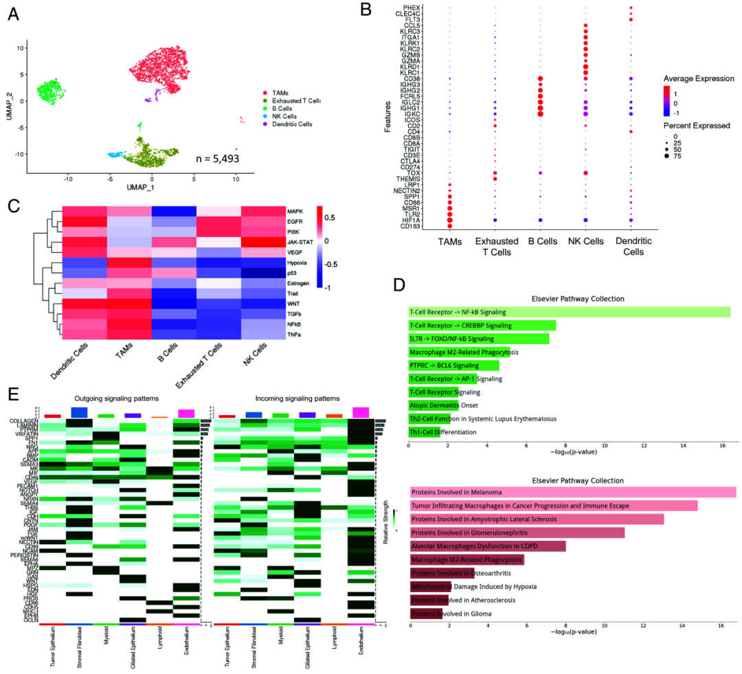 髓系細(xì)胞(尤其是腫瘤相關(guān)巨噬細(xì)胞TAMs)表達(dá)免疫抑制標(biāo)志物(CD163、SPP1、VEGFA、HIF1A),并高表達(dá)T細(xì)胞衰竭配體(如NECTIN2)。通路分析顯示TAMs富集于M2型巨噬細(xì)胞相關(guān)吞噬和免疫逃逸通路。